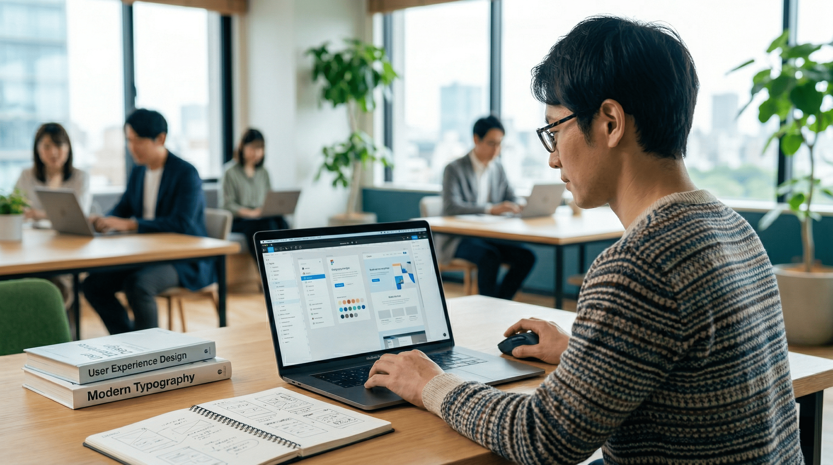 色彩理論、タイポグラフィ、レイアウトの原則など、美しく機能的なデザインを作るための知識が求められます。
