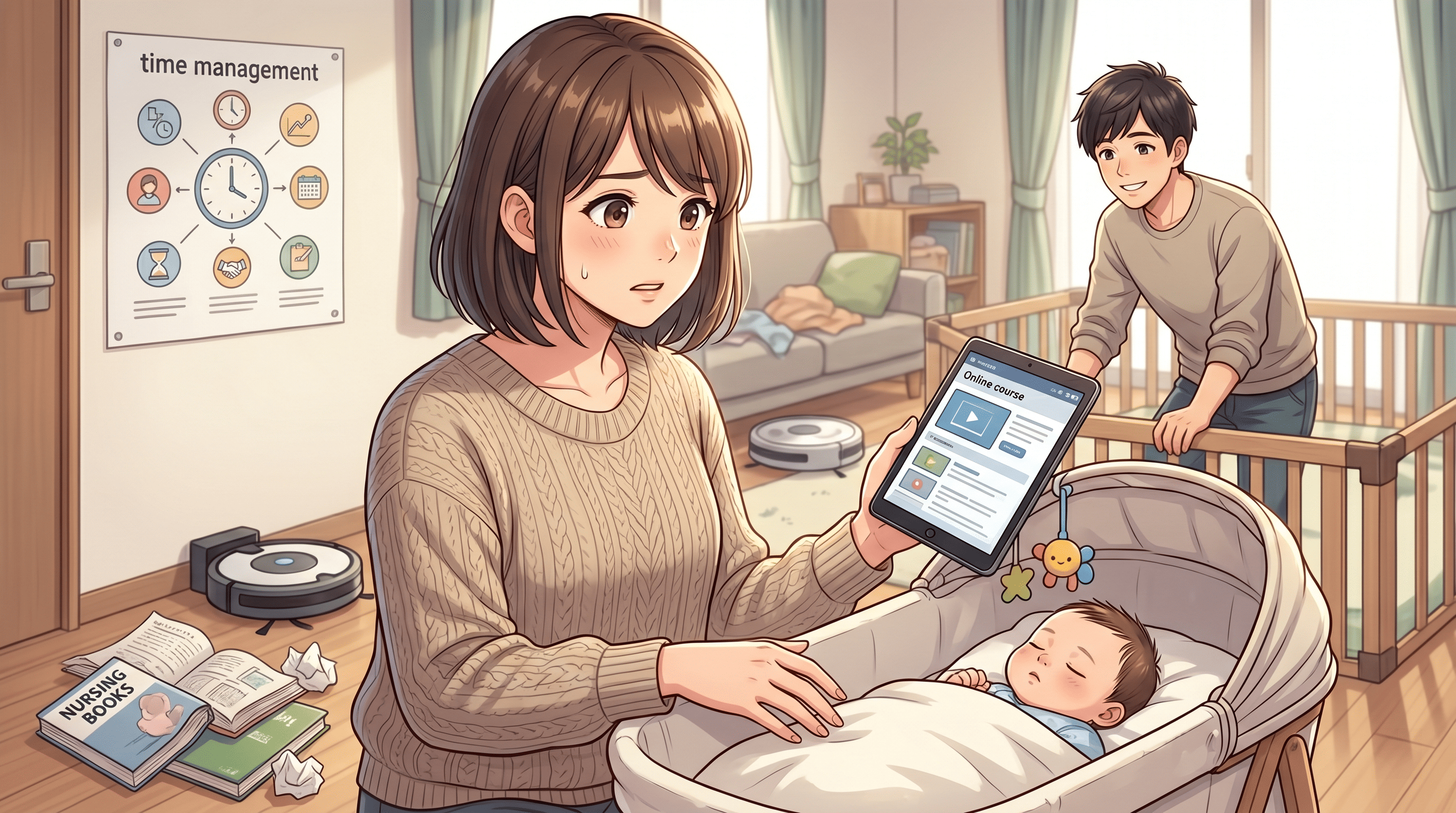 特に新生児期や夜泣きが続く時期は、十分な睡眠時間を確保することすら難しく、学習に集中できる時間を確保することは極めて困難です。